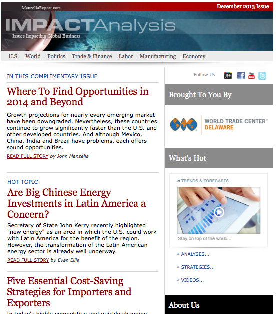 Impact Analysis, our flagship newsletter, features issues impacting global business and today's new economic realities. It is private labeled by world trade centers, state chambers of commerce and other organizations, and distributed via email to their respective audiences.